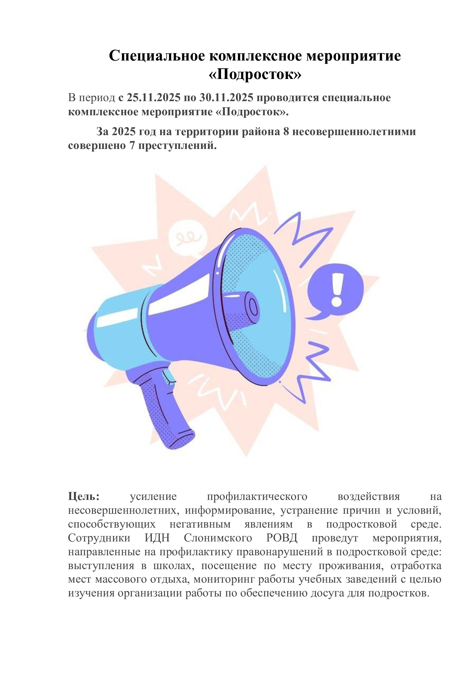 В период с 25.11.2025 по 30.11.2025 проводится специальное комплексное мероприятие «Подросток».