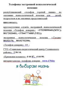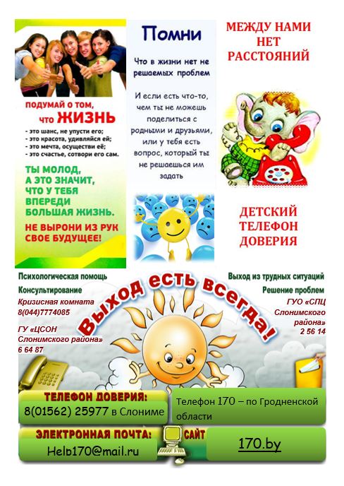 Круглосуточный телефон 8(0152)170 «Доверия» (бесплатный доступ для всех абонентов) для оказания психологической помощи несовершеннолетним, попавшим в кризисную ситуацию.