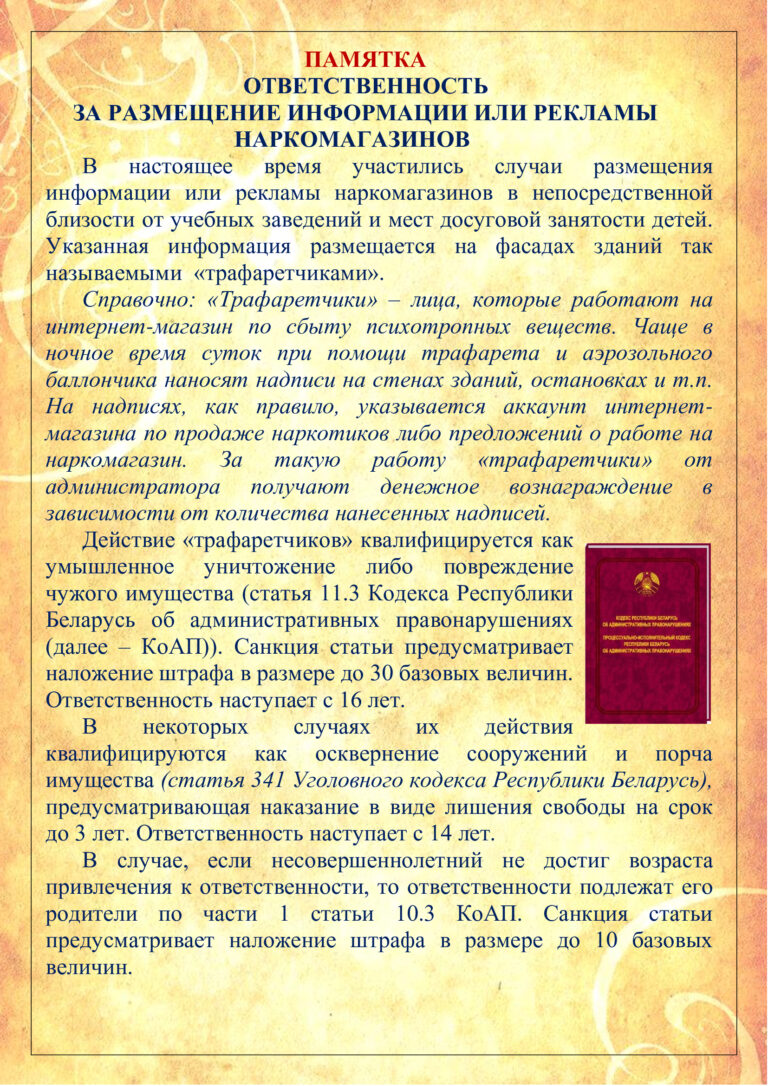 1.9. распития алкогольных напитков, слабоалкогольных напитков, пива, потребления наркотических средств, психотропных веществ, их аналогов, токсических и других одурманивающих веществ в зданиях, общежитиях и на иной территории учреждения образования (организации, реализующей образовательные программы послевузовского образования, иной организации, которой в соответствии с законодательством предоставлено право осуществлять образовательную деятельность) либо появления в указанных местах в состоянии алкогольного, наркотического или токсического опьянения;