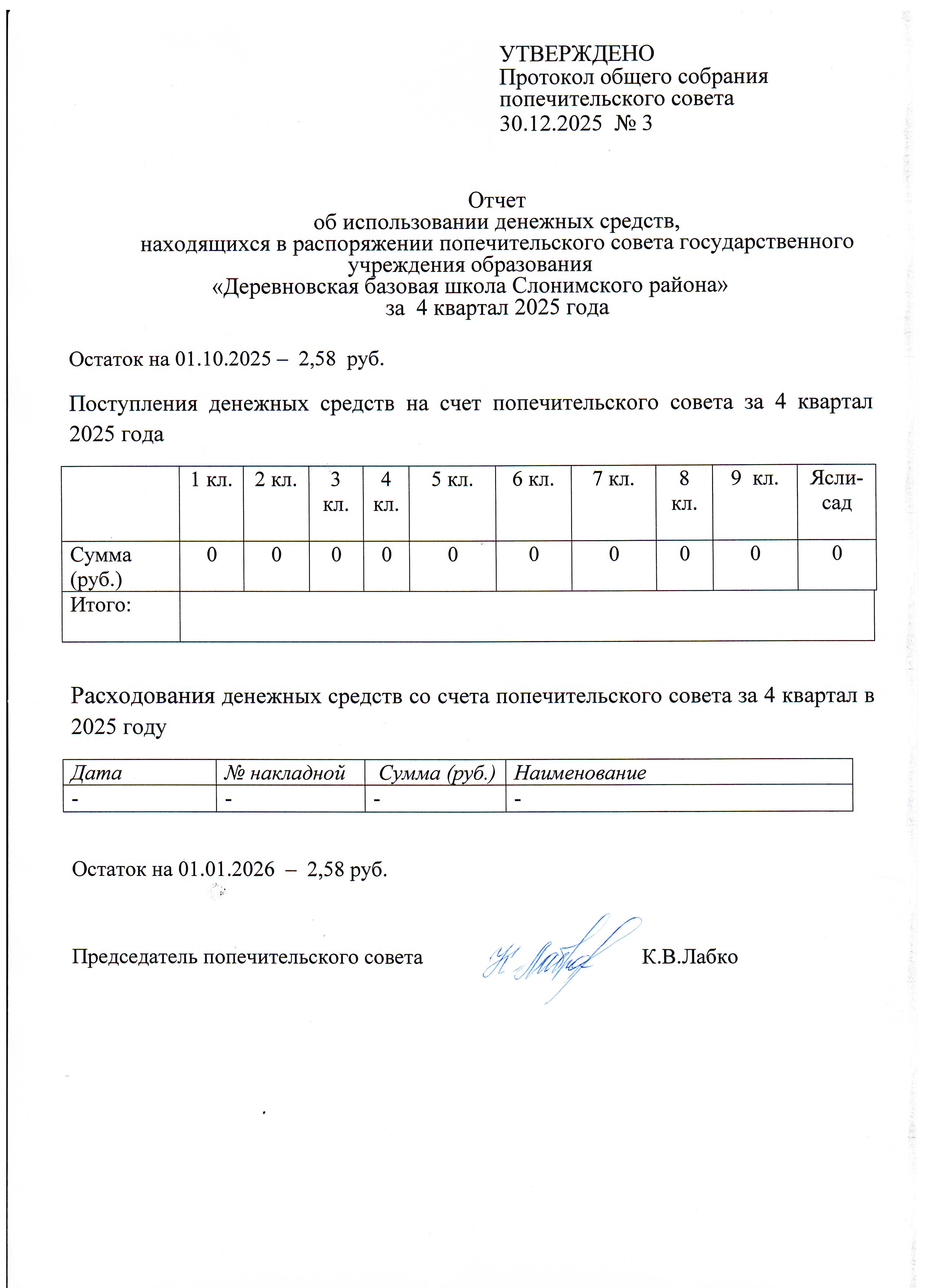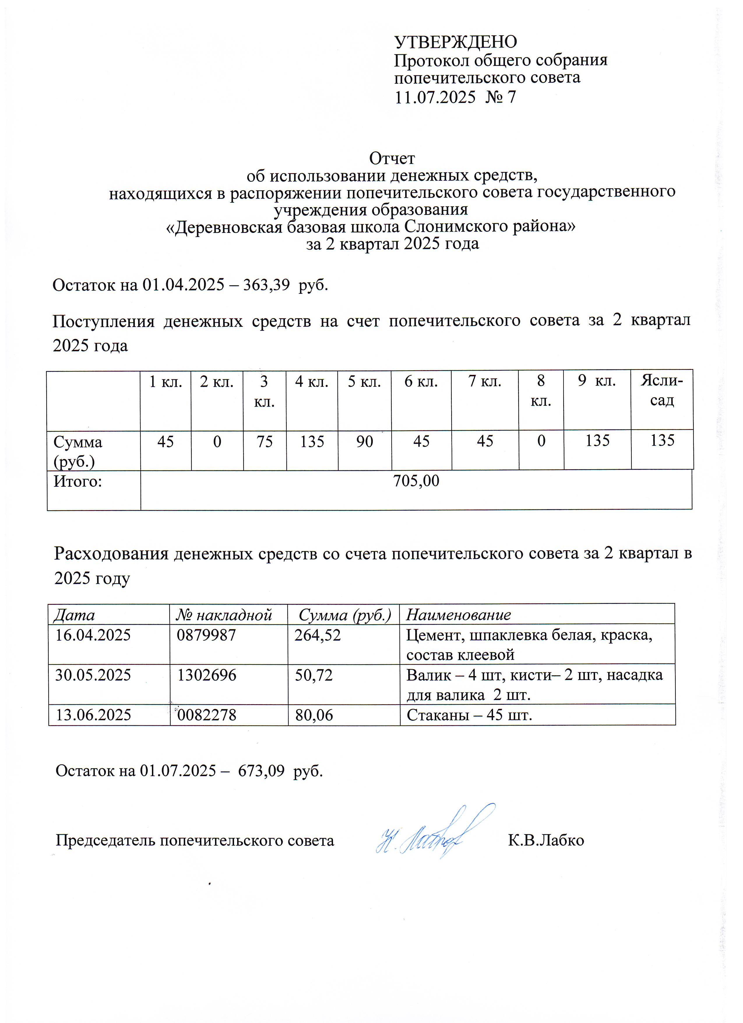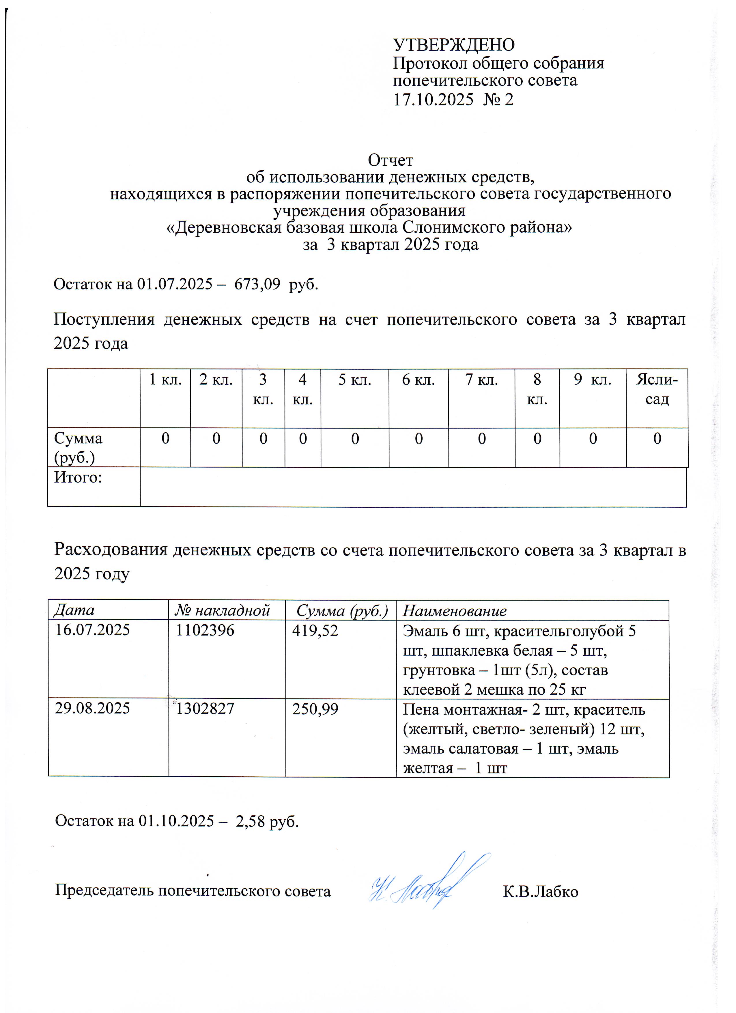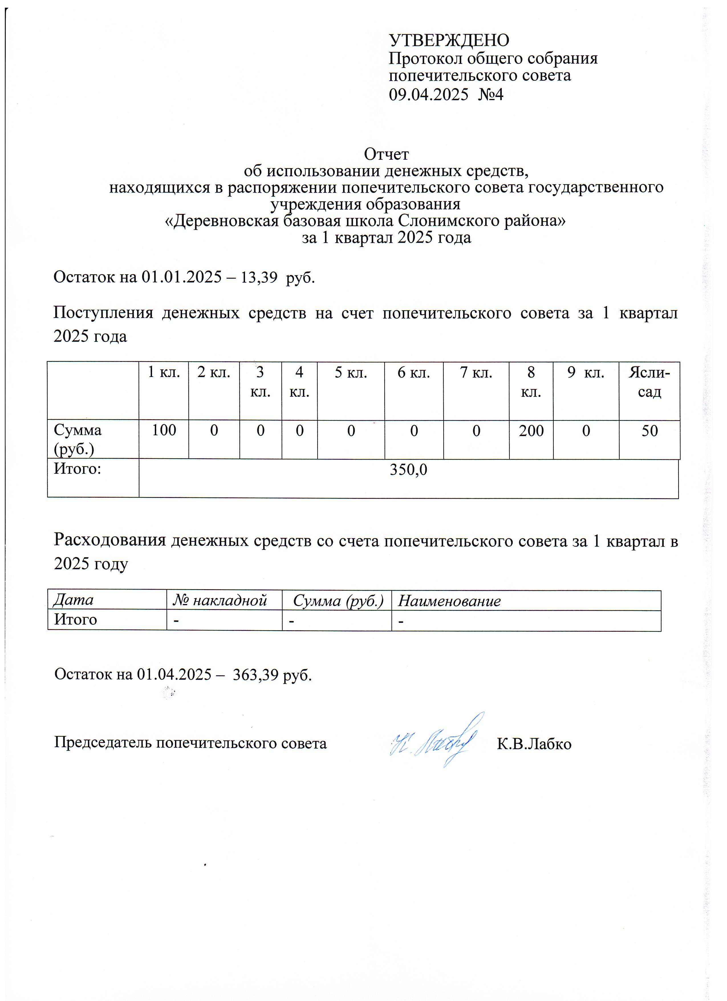 Отчет поступления и расходования денежных средств попечительского совета за 1-4 квартал в 2025 году